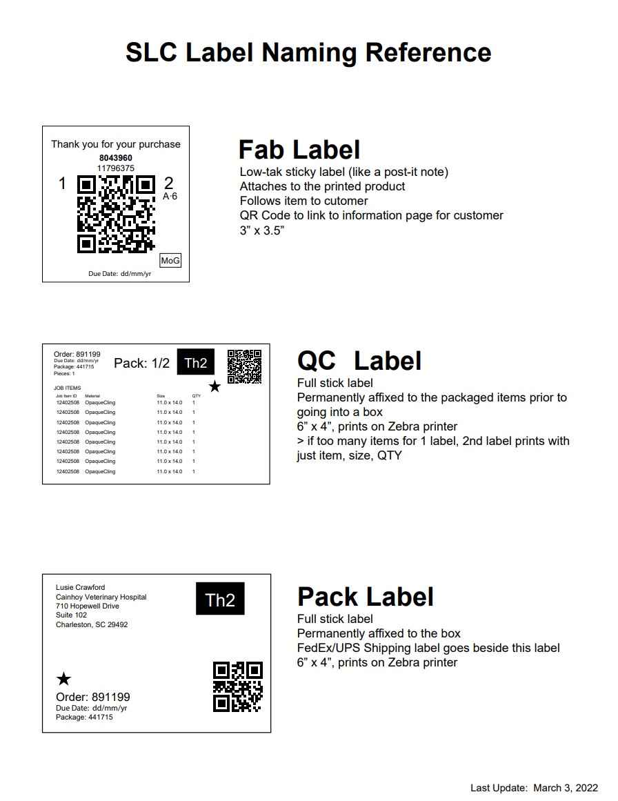 The Label API generates various labels that are used on the production floor. This API was created to generate labels that the Salt Lake City facility needed for their workflow. The current list of these labels are Fab Label, QC Label, Pack Label, and Incomplete Box Sheet. The Label API is currently only used by SLC, but new labels can be added for other facilities as well. Initially, Jaspersoft was utilized to generate these labels, but this generated images to send to the printer which caused significant performance issues. V2 endpoints have been created to generate ZPL versions of these labels that are much more performant. The Incomplete Box Sheet is the only label that isn't generated in ZPL format as it has image thumbnails on it. HTML with links to the image thumbnails is generated for the Incomplete Box Sheet.