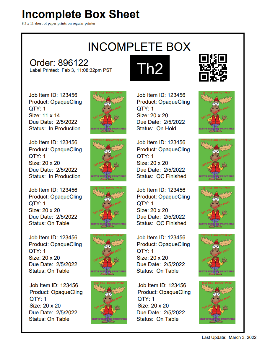 - Requires one or more job order ids and will generate an Incomplet Box Sheet for each order specified
